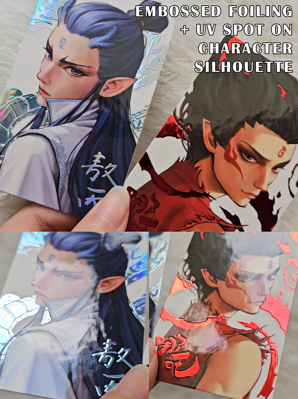 Ne Zha 2 premium and thick photocards with embossed foiling and UV spot on the characters's silhouettes, giving them a striking shine.