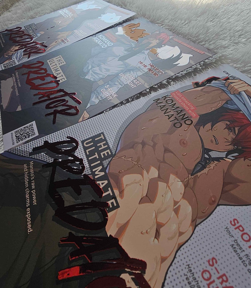 Komano Manato from Zenless Zone Zero, ready on A5 print. It has embossed red foiling and UV spot finishing, giving a luxurious look to the final product. Some texts are glossy, and the sweat beads are also reflective.